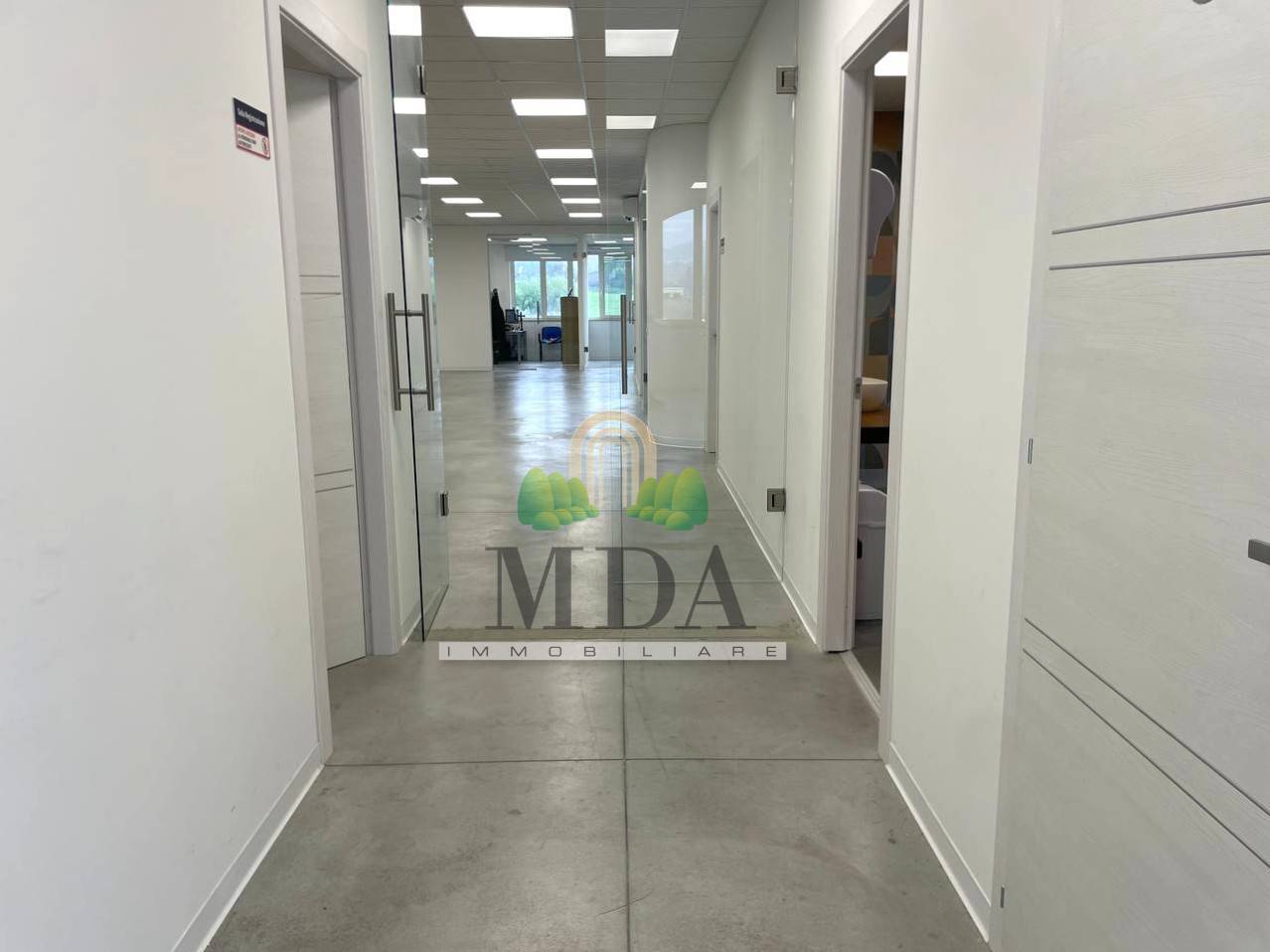 Piano primo: circa 453 mq, organizzato con diversi uffici, spazi operativi, aula formazione, sala audio, sala d’attesa, locale tecnico e area servizi con antibagno, quattro bagni e bagno per disabili.