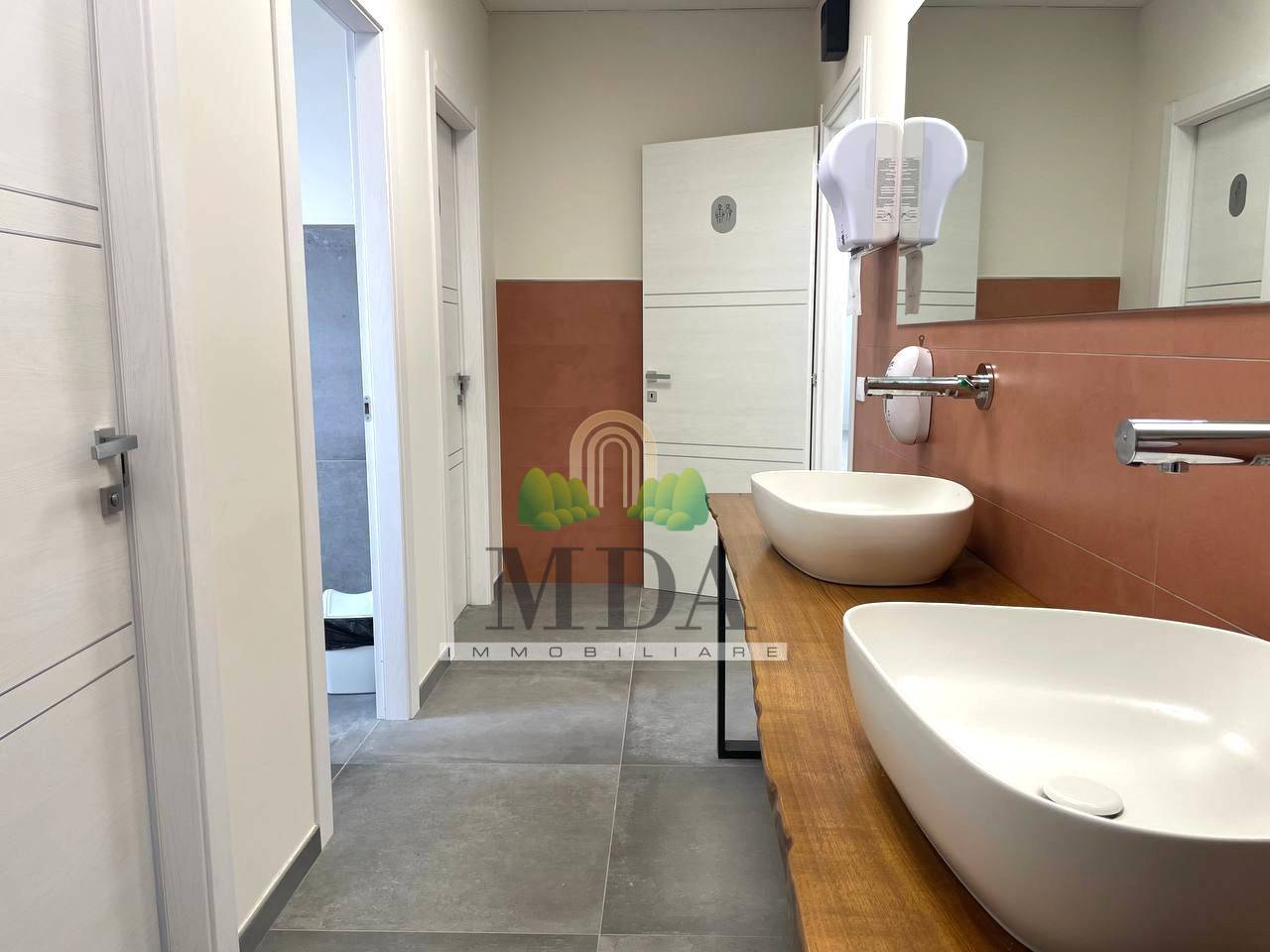 Per quanto riguarda i servizi, l’immobile dispone di otto bagni uomo/donna, due bagni per disabili (per un totale di cinque bagni per piano) e un ulteriore bagno attualmente da ultimare al piano seminterrato.