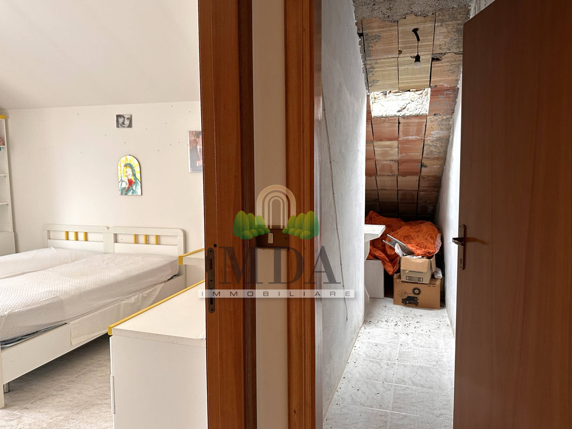 Attraverso la scalinata interna, posta all’ingresso, si raggiunge il primo piano, dove si sviluppa la zona notte composta da: disimpegno, camera matrimoniale, camera singola e bagno finestrato con vasca.