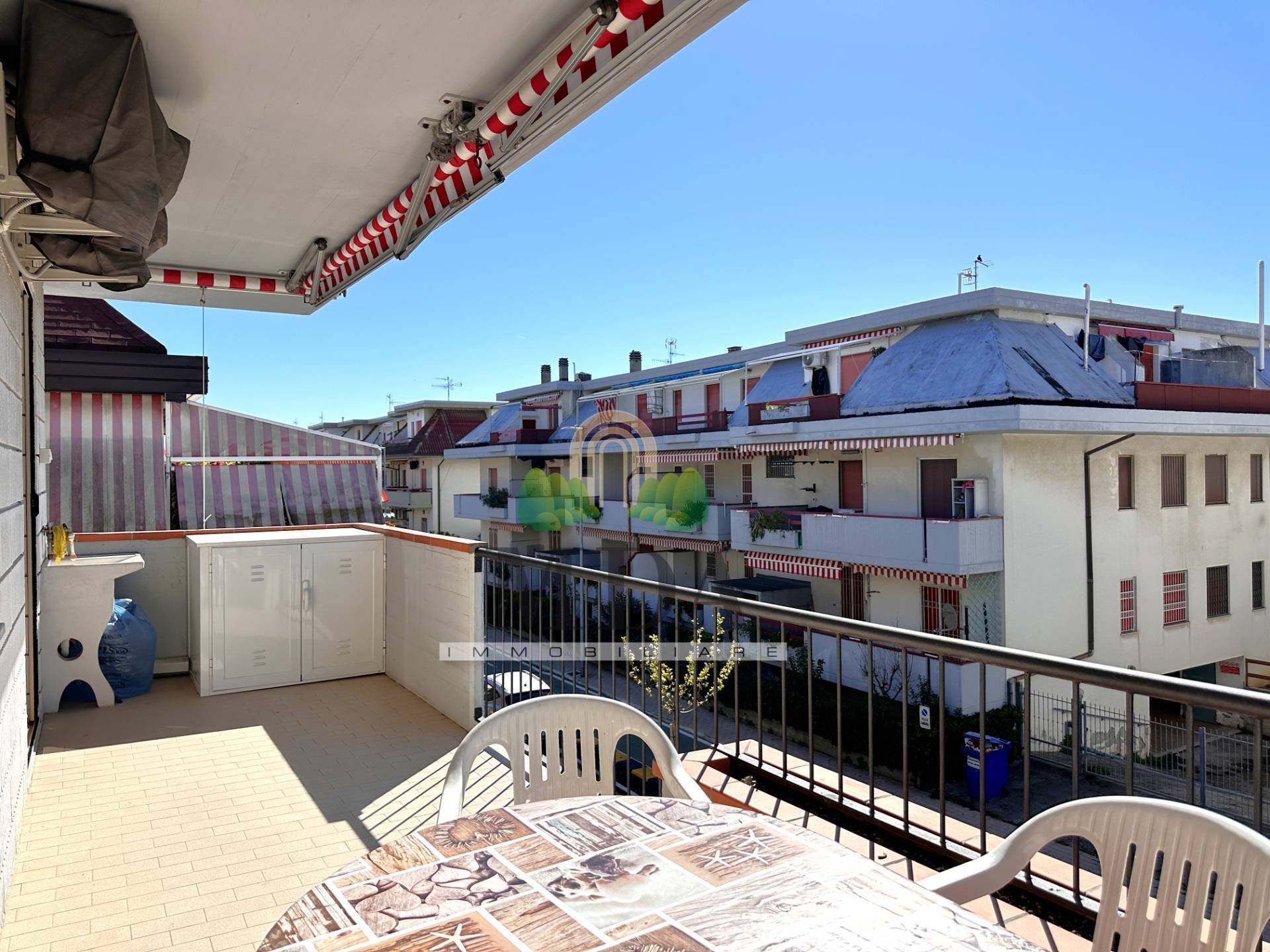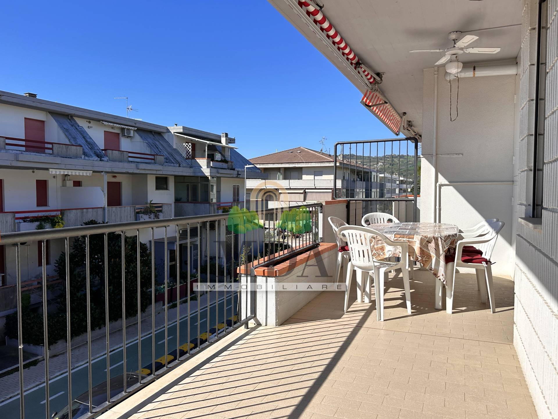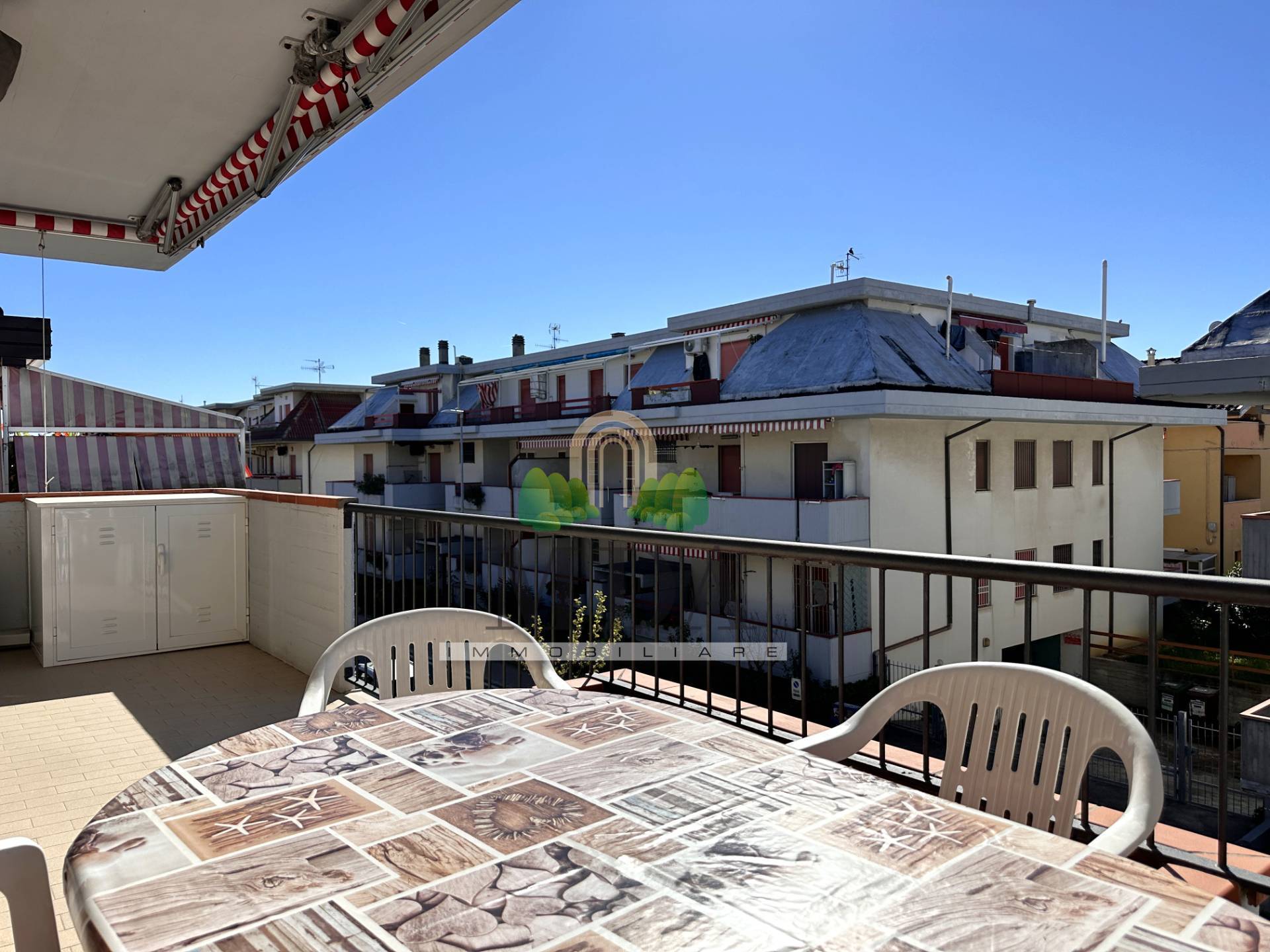 Dalla zona giorno e dalla camera matrimoniale si accede ad un ampio terrazzo di 17 mq. circa, dotato di tende da sole.